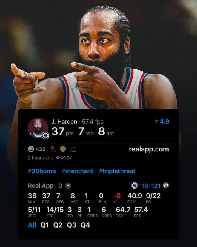一边目睹哈登再次扛起球队对阵凯尔特人
